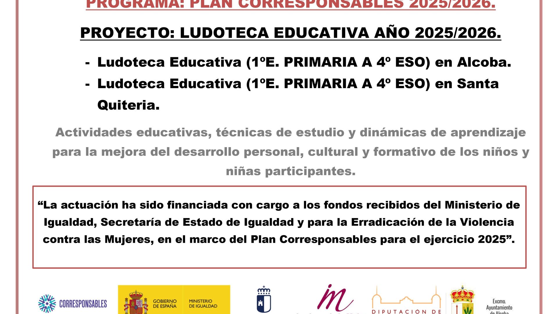 - La actuación ha sido financiada con cargo a los fondos recibidos del Ministerio de Igualdad, Secretaría de Estado de Igualdad y para la Erradicación de la Violencia contra las Mujeres, en el marco del Plan Corresponsables para el ejercicio 2025